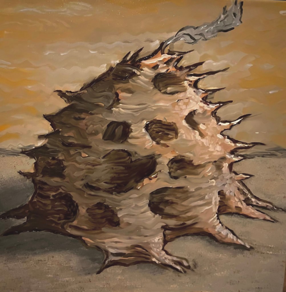 Mert igazából egy körforgást akar ábrázolni. A bal alsó sarokban lévő tölténydobozból golyót elcsenő kisegér indítja el a folyamatot, amely a bőr alatt végig haladó, jobb kézben tornyosuló puskacsőben fejből szétloccsanó pipacs az új ihlet, ötlet gondolatát szimbolizálja. A körülötte lézengő alakok mind az alkotásnak torzulásai, széthullása. Az ebből kikúszó kígyó indul el levadászni a kis egeret, amelyik adagolja a lőszert. A gondolatokkal való játék és az ötletek reflektálása egy ördögi körré alakul. A rajz megfordításával egy démoni mosolyt fedezhetünk fel, ami az egész jelenetet egy belsőséges perspektívából közelíti meg. Ugyanis a kéjes mosoly arra utal, hogy bármit is teremtünk, az alkotásnak ára van.