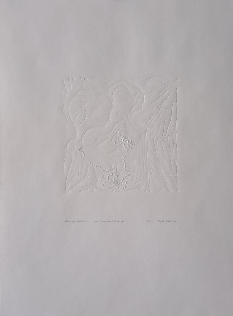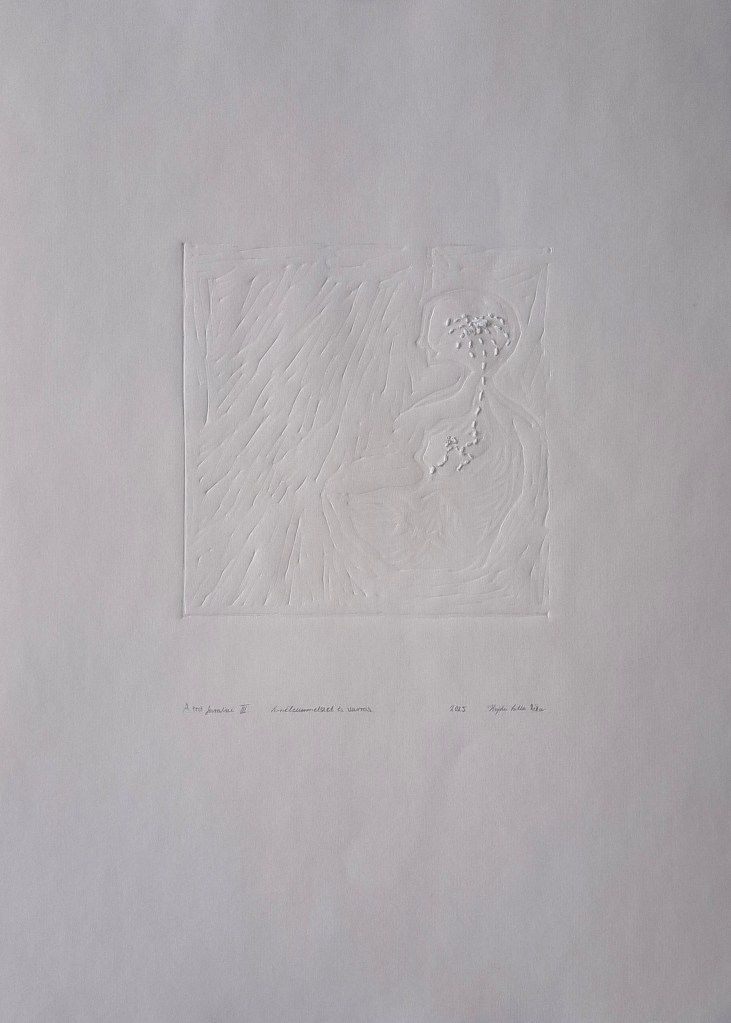 A sorozat kísérleti jelleggel készült, amely során fontosnak tartottam, hogy a linóleummetszetet sterilizált módon jelenítsem meg, ezért képeztem dombornyomást, amelybe belevarrtam fehér cérnával. A koncepcióm alappillére a kapcsolódás, amely során a testnek azon részeit kívánom megragadni, amelyben olyan folyamatok zajlanak le, amelyek szabad szemmel nem láthatóak, de lerakódnak és az anyagot felsértik. A fehér cérna számomra ezt az állapotot hívja elő, ugyanis sejtelmesen burjánzik, csakúgy, mint a test benső szegleteit érintő lenyomatok, amelyek dombornyomott formában láthatóak.