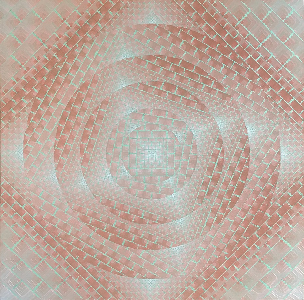 Pécs különleges közeg: egyszerre erős hagyományokra épülő és nyitott, kísérletező város. Victor Vasarely öröksége nem lezárt fejezet számomra, hanem egy élő gondolkodási alap, amely újra és újra aktualizálható. Saját munkáimat egyfajta átmeneti térben látom: tiszteletben tartják a pécsi geometrikus és konstruktív hagyományokat, ugyanakkor reflektálnak a kortárs vizuális túlterheltségre, digitális mintázatokra és a mentális állapotokra. Nem újraformálni szeretném Vasarelyt, hanem párbeszédbe lépni vele a jelen vizuális nyelvén.
