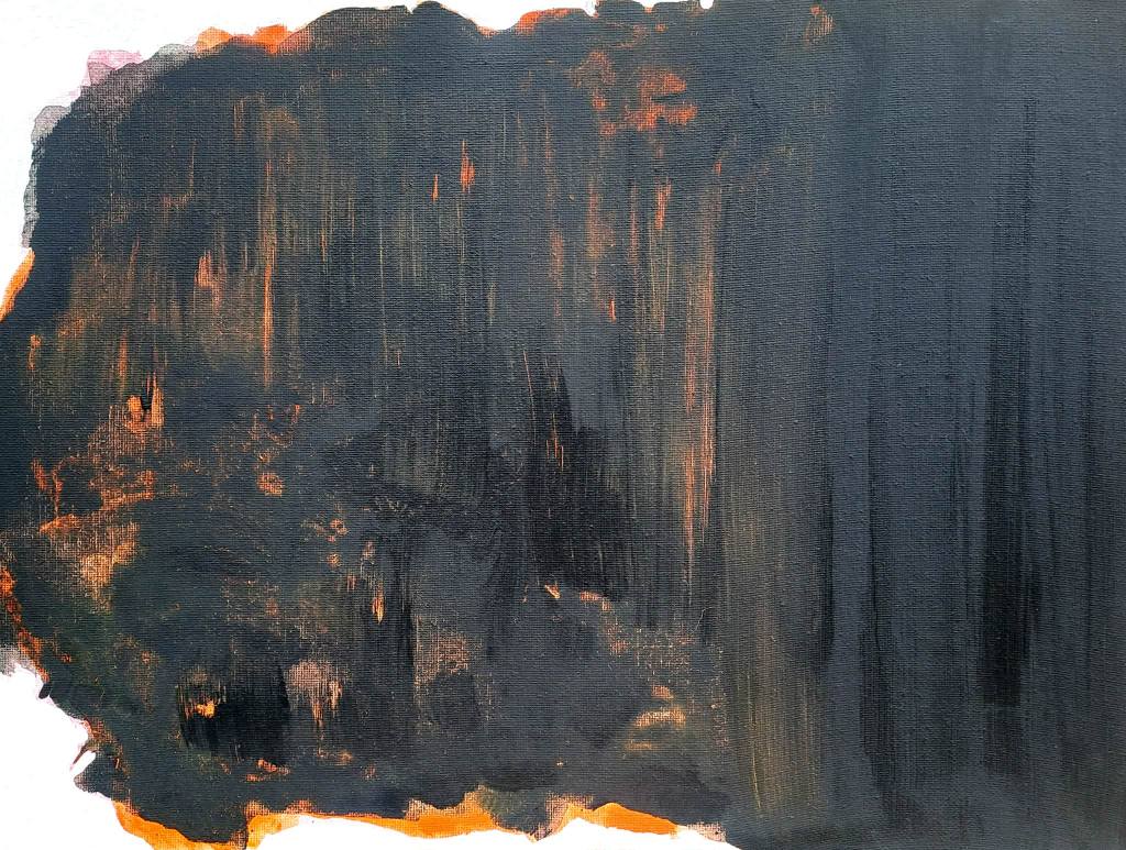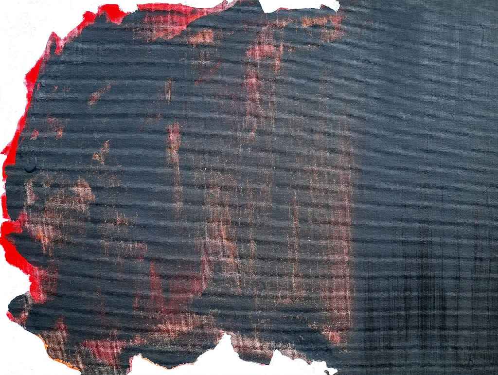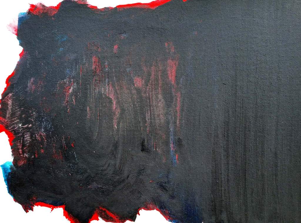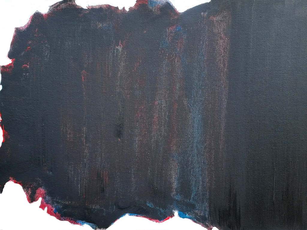 Az alkotást két mezőre bontottam: először a kiválasztott elsődleges és másodlagos színeket kentem fel a vászon felületére, a fekete színnel egyetemben. Száradás után egy vizetett fekete festékkel finoman rámentem, fontos volt, hogy az adott színek láthatóságát megőrizzem, miközben egyensúlyba kerülnek a fekete mélységével.